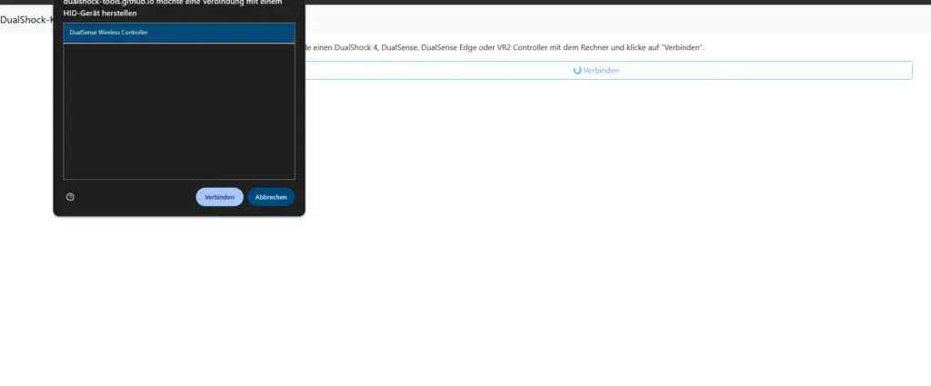 WICHTIG: Benutze als Browser unbedingt Google Chrome, Opera oder Microsoft Edge, da andere Browser aktuell die benötigte WebHID-Schnittstelle nicht unterstützen. Achte zudem darauf, dass du das akuellste Controller-Firmware-Update heruntergeladen hast, da bei veralteter Firmware die Funktionen des Tools eingeschränkt sind. - Auf der Webseite klicken Sie nun auf Verbinden, woraufhin sich ein graues Kästchen öffnet worin ihr Controller angezeigt werden dürfte (“DualSense Wireless Controller” o.ä.). Wählen sie ihren Controller aus, sodass das Kästchen dahinter als blau eingefärbt anzeigt. Sodann drücken Sie darunter auf den Button “Verbinden