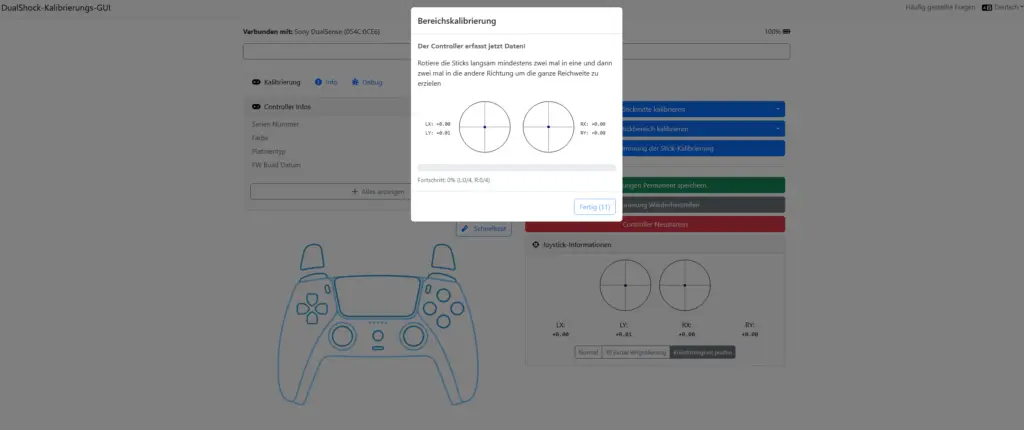 (Anmerkung: Falls du vergisst, die Sticks zu bewegen und trotzdem auf “Fertig” klickst, erscheinen die Sticks in der Ecke fixiert. Behebe den Fehler indem du die Kalibrierung der Stickrange nochmal von neu beginnst.)